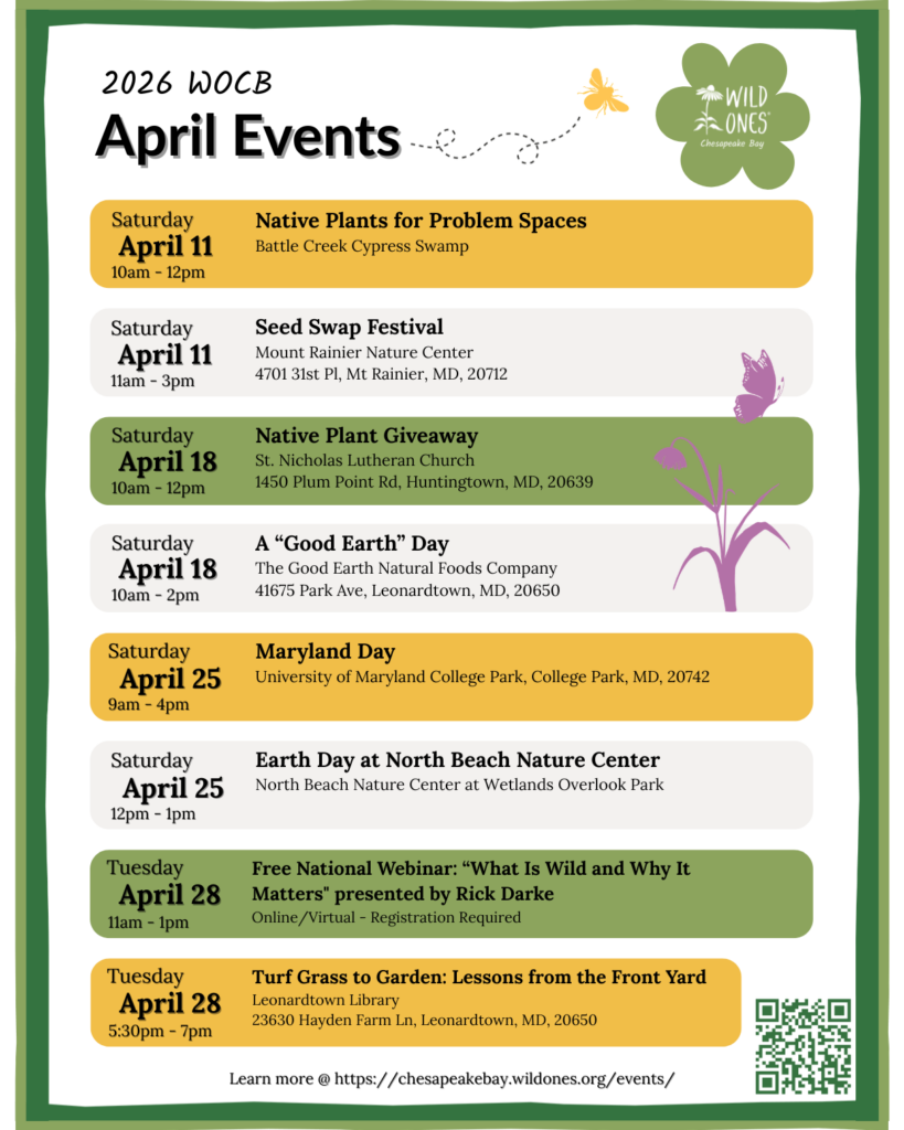 - April 2026 HappeningsSpring is in full swing for Wild Ones Chesapeake Bay! 🌷🎡From spring “cleaning” in three of our partner gardens to installing a new pollinator garden at the Good Earth Natural Food Company, we are enjoying getting back out in the fresh air with our hands in the soil. ICYMI – In Case You Missed It… Read more: April 2026 Happenings