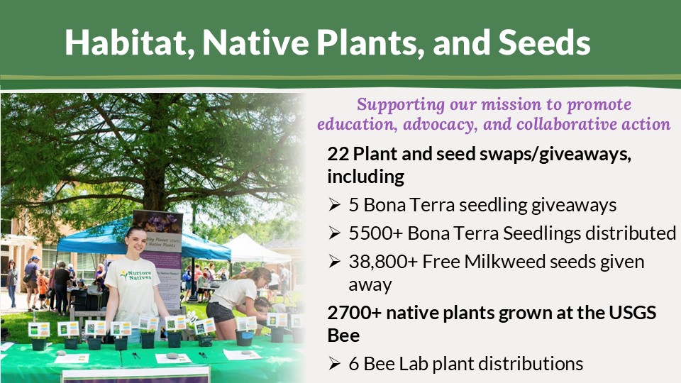 Our members participated in an amazing 22 plant and seed swaps and giveaways, with most of the plants and seeds coming from our collaboration with Bona Terra’s Plant Grant program. In addition, our members grew over 2700 native plants at the USGS Bee Lab and distributed them at 6 events.