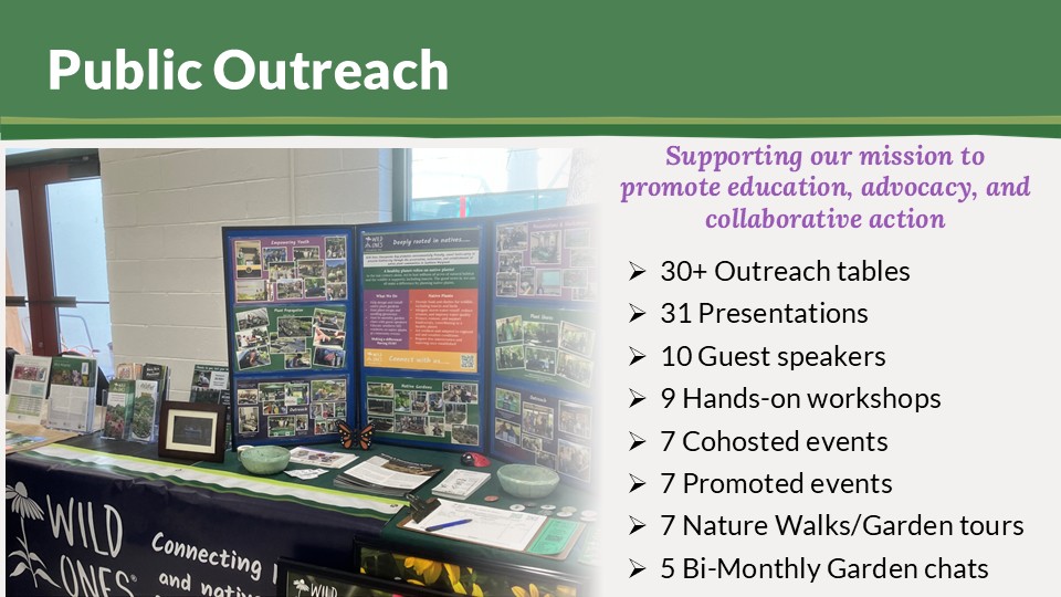 This year saw record numbers in our public outreach initiatives. Our members were busy year-round sharing our passion for native plants through outreach tables at events, live and virtual presentations (some with guest speakers), workshops, garden tours, and our bimonthly garden chats. One of the strategies we used to expand our outreach was to cohost and/or promote events with other local Wild Ones chapters or other nonprofit organizations that share a similar passion for native plants.