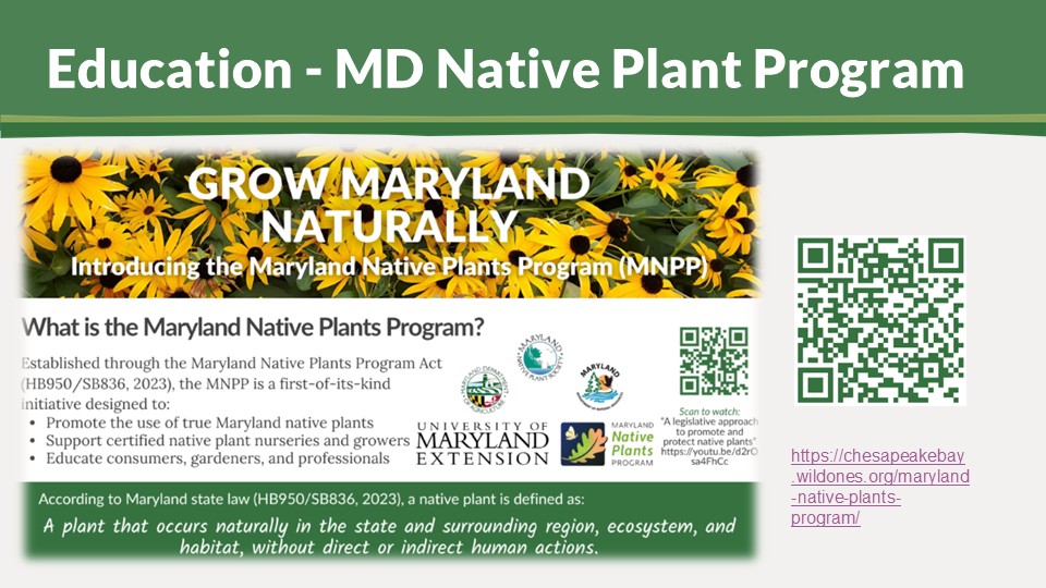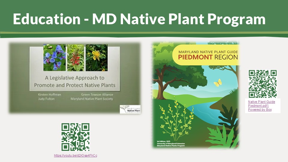 You can watch our recorded presentations on our YouTube channel, including the presentation that we hosted earlier this year on the MD native plant and invasive plant bills. You can also access an online PDF of the NEW Maryland Native Plant Guide for the Piedmont Region. It is a beautiful resource, and hard copies will be available for sale through the Maryland Native Plant Society website, with two additional guides scheduled for publication in 2026 (Coastal Plains Region) and 2027 (Mountain Region).
