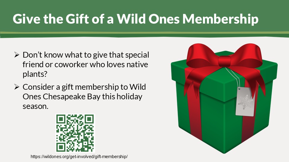 If you would like to support Wild Ones Chesapeake Bay programs and activities and show gratitude and appreciation for our work, please consider a donation to our chapter to help fund our future endeavors in the community. Or perhaps you’d like to help grow our chapter by joining our chapter or giving a gift membership to a friend or family member who shares our passion for native plants.