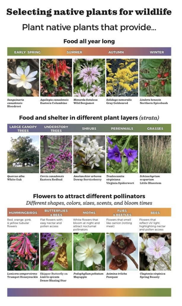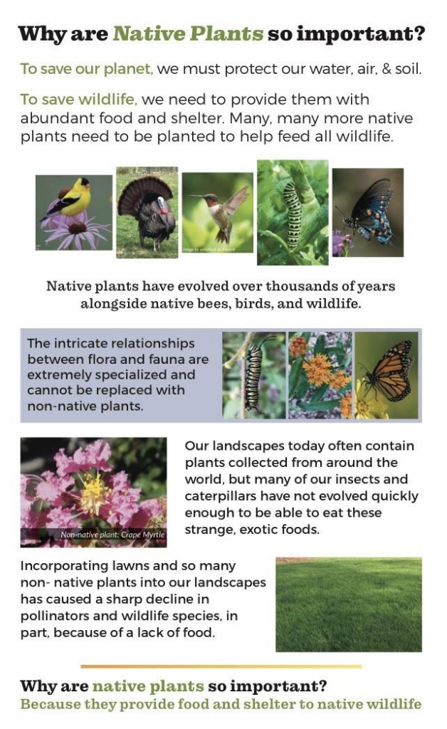 - Whereas native plants provide shelter, as well as nectar, pollen, seeds, and foliage that serve as food for native butterflies, caterpillars, birds, bees, and other wildlife in ways that non-native plants cannot;