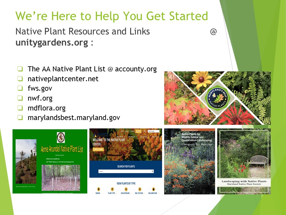 We would like to thank Unity Gardens for their inspiring presentation which included an introduction to Unity Gardens (Pat Mitchell), informative content about native plant selection geared towards native plant enthusiasts (Mary Yee) and followed by information on applying for either a Unity Gardens grant or a Chesapeake Bay Trust Community Engagement and Restoration Mini Grant (Richard Hergenroeder).