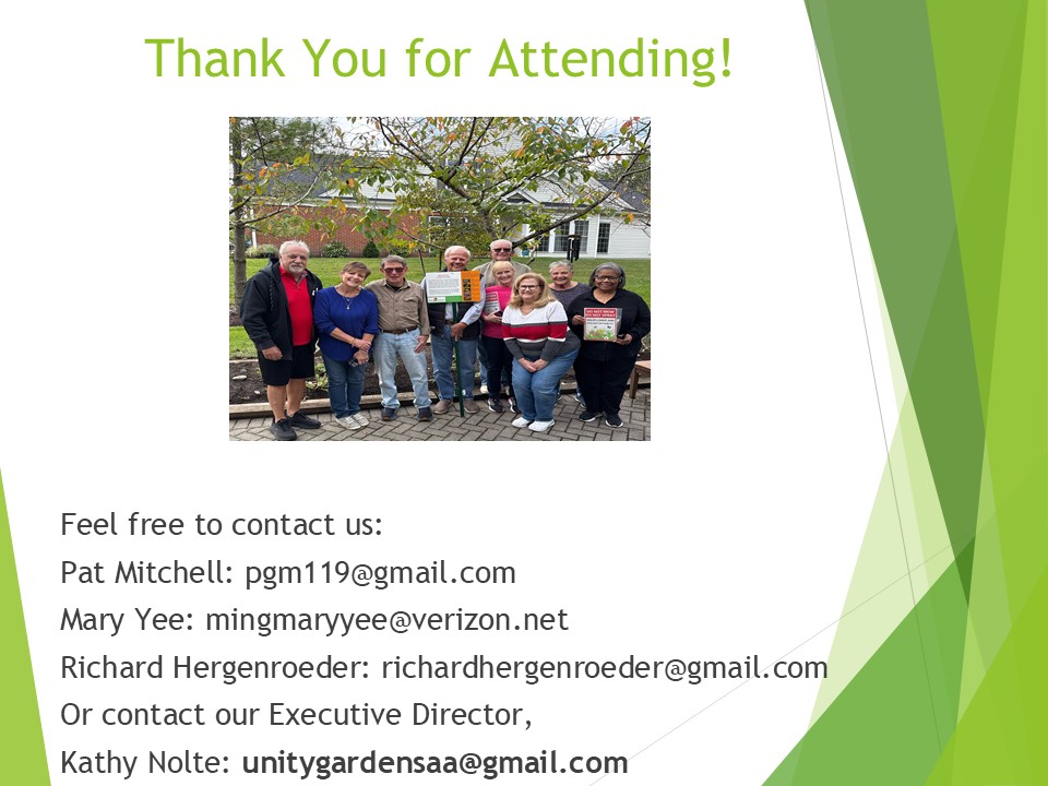 Feel free to contact Pat, Mary, Richard, or Kathy Nolte, Unity Gardens Executive Director.