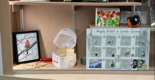 To further share our love of winter sowing, we included a section in our display at the Twin Beaches Public Library that showcases some of our favorite winter thing. Native plants provide such a beautiful color palette in winter, and we hope visitors to the display will appreciate the beauty of winter in the native garden and the opportunity to get their hands in soil in the middle of winter by winter sowing.