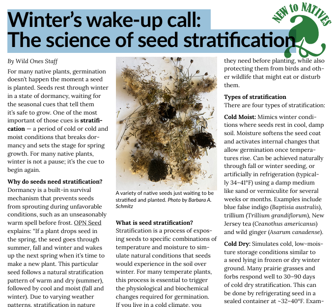 Did you know that many native seeds need a period of cold, moist stratification before the seed will germinate? If you missed it, check out the article in the Wild Ones Journal (Winter 2025) for “Winter’s wake-up call: The science of seed stratification.” Written by Wild Ones Staff, the article explains why seeds need stratification, what it is, and the four types of stratification.