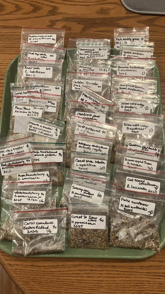 Earthly Delights Native Gardening LLC spotlighted our chapter’s fall seed-collecting efforts, illustrating how seed gathering not only supports native plant propagation but also transforms volunteers into committed conservationists. “Seed collecting is contagious, and the bug was passed on to me by my amazing friend Marlene Smith. I met Marlene in January of 2024 when I went to my first volunteer event at the USGS Bee Lab. All I knew when I signed up was that someone would tell me what to do to help them propagate native plants, and in return I could take some home. Bonding over our shared love of spreadsheets, Marlene… took me on as a student and partner-in-crime. Together with Bill, Marlene’s witty and kindhearted husband, and Misty, their pampered service pup, we raised around 2,700 plants last year [2024].” ~ Chapter member Miranda Yourick, Seed Collecting Season, October 3, 2025