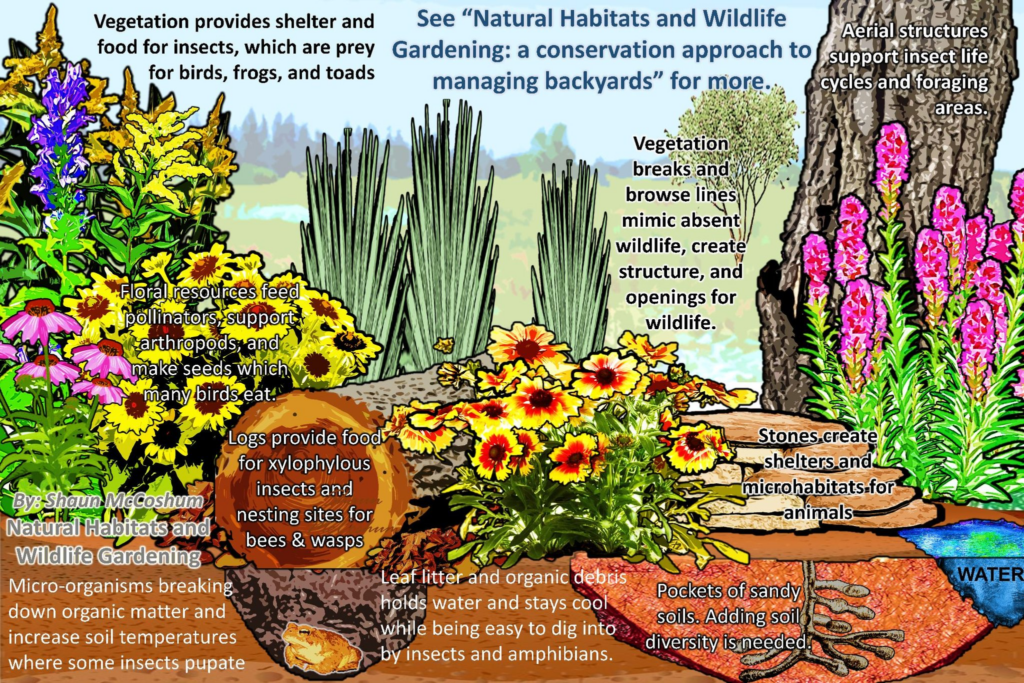 Managing our yards can have an untidy appearance especially if the goal is something like a cottage garden. However, picturesque landscapes and habitats are never referred to as messy, so why are we insulting our gardens? Wood and woody stems can be stacked neatly or hidden behind large shrubs, downed leaves should be cleared from hard surfaces and short-growing full sun plants then repurposed for mulch around larger perennials or compost piles. Plants can be arranged in layers, with low-growing plants around borders and taller plants further into garden beds. The final looks should aim to be more like a picturesque, healthy habitat more than an overgrown weed-lot detached from the natural systems that manage them. We should not try to do as little disturbance as possible; instead we should understand our role as a steward of the land is to be the absent animals and processes that sculpt spaces into beautiful spaces that are essential to wildlife. ~ Shaun McCoshum, PhD