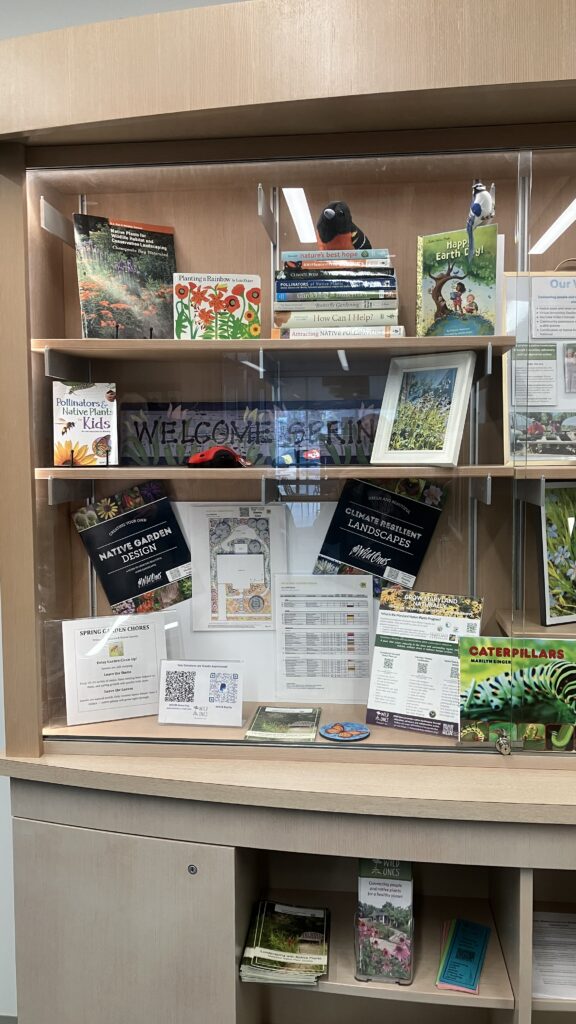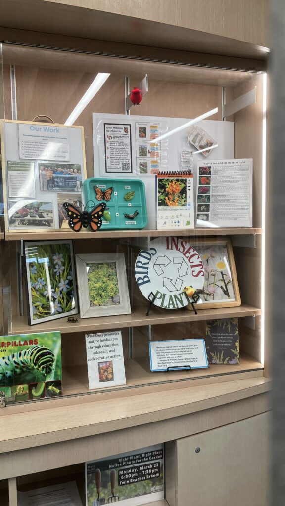 On Monday, several chapter members converted the display case at the Calvert County Public Library in Twin Beaches from its “Winter in the Garden” theme to its new “Welcome Spring” theme. The spring display includes a section on garden design, photos of native plants to look forward to as plants come out of dormancy, “milkweeds for monarchs” information, and of course an assortment of our favorite books. Many of the materials in the display case include QR codes for patrons to scan and access online documents, plus there are shelves below the display case filled with Wild Ones literature and coloring sheets for the kids. Thank you, Sue, Robin, Marlene, and Bill, for your creativity. The display will remain until the end of March. Check it out and find out how you can connect with native plants.